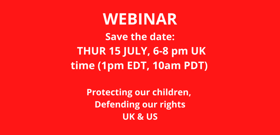 | THUR 15 JULY, 6-8 pm UK time (1pm EDT, 10am PDT) Register WEBINAR: Protecting our children, Defending our rights – UK & US Ending “child welfare’s” massive and heartless removal of children from low-income mothers and families, often children of colour. LAUNCH of UK and US self-help guides for mothers and other primary caregivers struggling to protect our children from arbitrary state removal, forced adoptions, and violent fathers. LAUNCH of new research based on casework in the UK over the past four years: who is being targeted, the reasons given, impact on children, mothers’ personal experiences of going through sexist, racist, disablist and class biased family courts. LAUNCH of SNS in the US which brings together campaigners coast to coast. Speakers include: Mothers who have gone through the family courts in UK & US A child who was removed is now back with his family Women Against Rape which has been defending victims of domestic violence accused of lying Dr Adrienne Barnett, author of the literature review on Domestic Abuse and private law children cases which accompanied the government Harm report into the treatment of domestic abuse victims, which found the family courts ‘racist, sexist and class biased’ Victoria Childs, Psychotherapy and Counselling Union Phoebe Jones and Margaret Prescod (Global Women’s Strike and Women of Colour GWS) who are campaigning for a care income, and supporting legislation in the US like the Poverty Is Not Child Neglect Act to ensure families are not separated because of poverty. Register free on Eventbrite here. Email us if support needed. British Sign Language/English interpretation and speech-to-text For more information contact: UK: sns@legalactionforwomen.net 0207 482 2496 Philadelphia: philly@allwomencount.net 215-848-1120 Los Angeles: la@allwomencount.net 323-276-9833 |