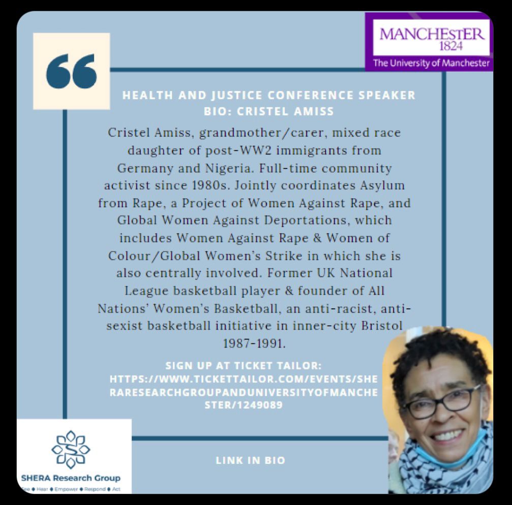 Cristel Amiss, is a grandmother/carer, mixed race daughter of post-WW2 immigrants from Germany and Nigeria. Full-time community activist since 1980s. Jointly coordinates Asylum from Rape, a Project of Women Against Rape, and Global Women Against Deportations, which includes Women Against Rape & Women of Colour/Global Women’s Strike in which she is also centrally involved.